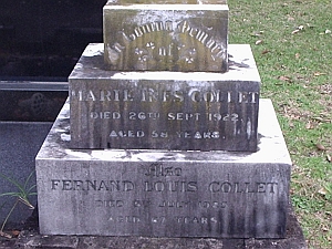 adopted the religious name of Sister Urban while Malvina became Sister Beatrice. Fernand would only outlive his wife by a few years, dying at the age of 66 years on the 5th July, 1925, at his brother-in-law, Evariste Dubois' home, "Villa Des Roses", Grosvenor Road, Lindfield. Fernand Collet's funeral was held on Tuesday, 7th July, leaving from his home at 10.00 am for the Catholic section of Northern Suburbs Cemetery. Information Sources: Lamb, Karen (2005), History of Louis Michel Fernand COLLET , unpublished.