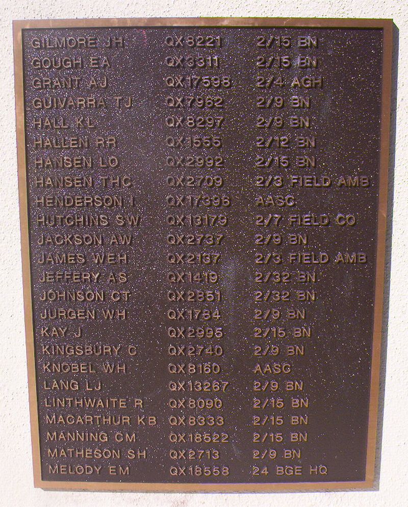 Victoria. Enlisted 21 October 1939. Discharged 14 December 1945. (This Soldier had no association with Mackay however was mates with the blokes who organised the plaques and was added). |